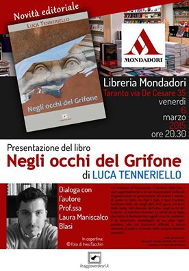 Incontro con l’autore Luca Tenneriello ospite venerdì 6 marzo 2015 della libreria Mondadori di Taranto. Sarà la prof.ssa Laura Maniscalco Blasi a dialogare con Luca Tenneriello che a partire dalle ore 20:30 presenta nella sua città natale il romanzo d’esordio “Negli occhi del Grifone”, edito da Il Raggio Verde.