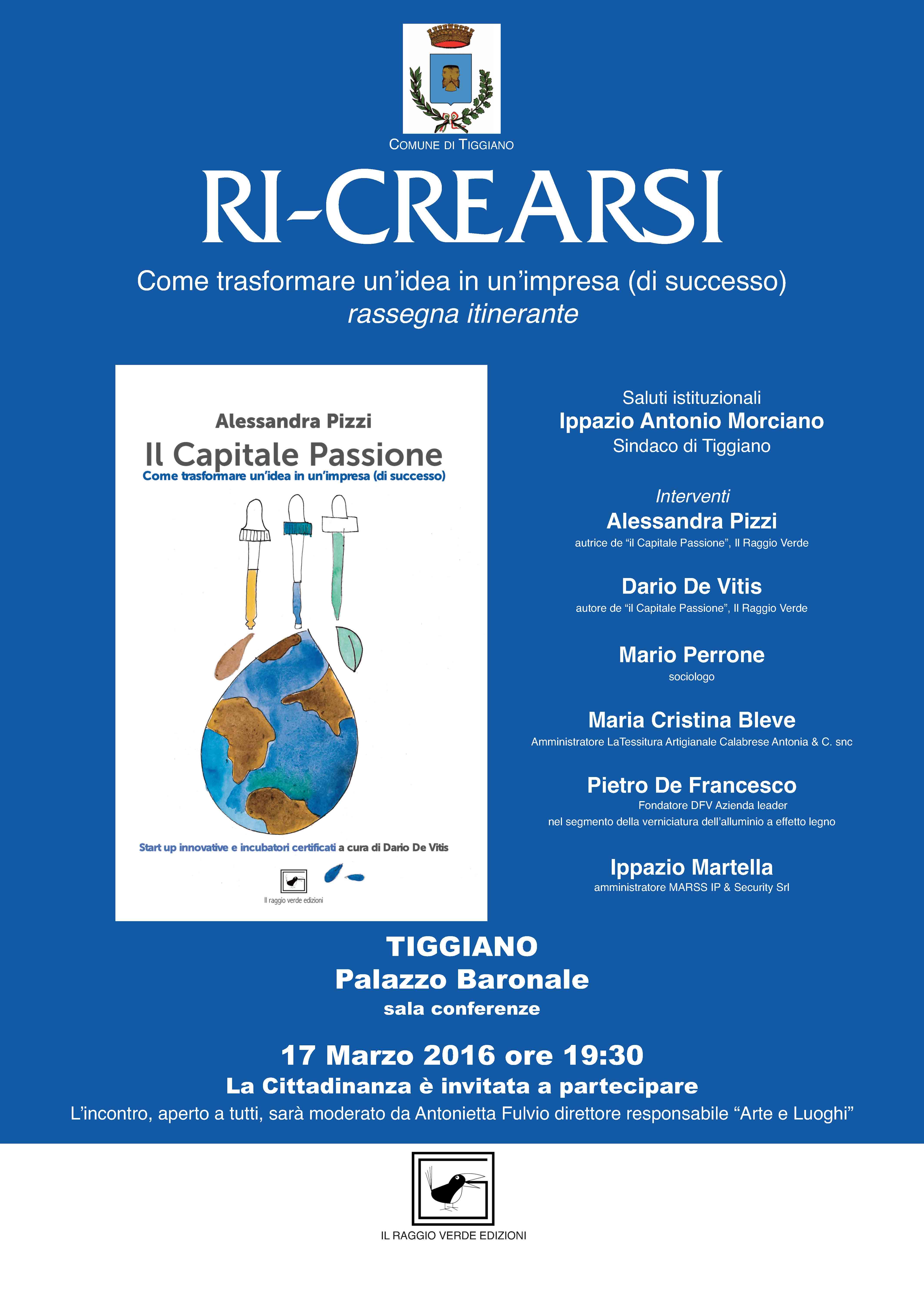 Giovedì 17 e venerdì 18 marzo 2016. L’Istituto “E. Vanoni” di Nardò, il Palazzo Baronale di Tiggiano e la sala Civica di Copertino: sono le prossime tappe della rassegna “Ri-Crearsi” che ruota intorno al libro “Il Capitale Passione” di Alessandra Pizzi e Dario De Vitis