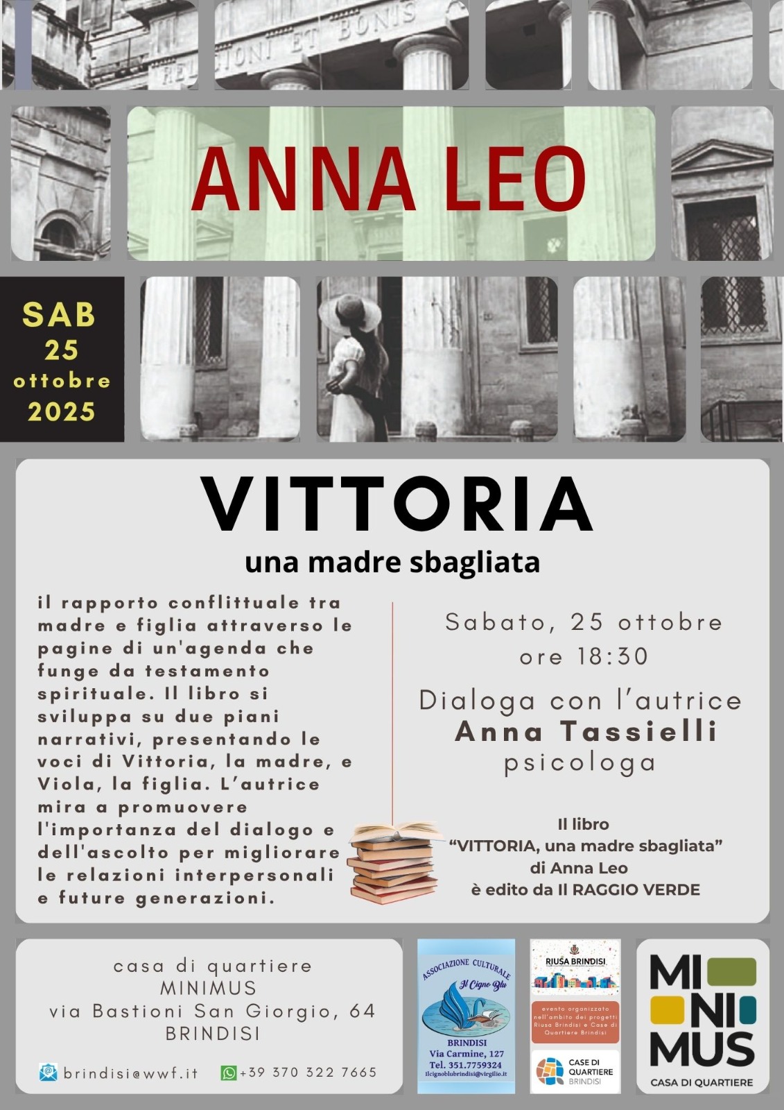 Si terrà a Brindisi sabato 25 ottobre la presentazione del libro “Vittoria una madre sbagliata” di Anna Leo, edito da Il Raggio Verde, sociologa e scrittrice.